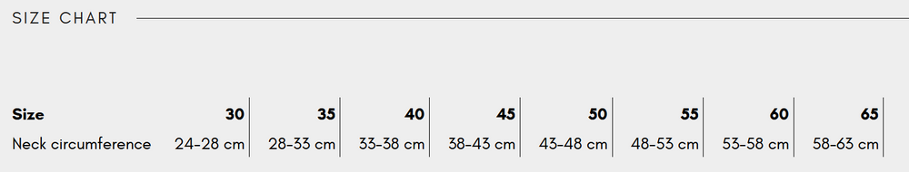 | Neck circumference | 24-28cm | 28-33cm | 33-38cm | 38-43cm | 43-48cm | 48-53cm | 53-58cm | 58-63cm |