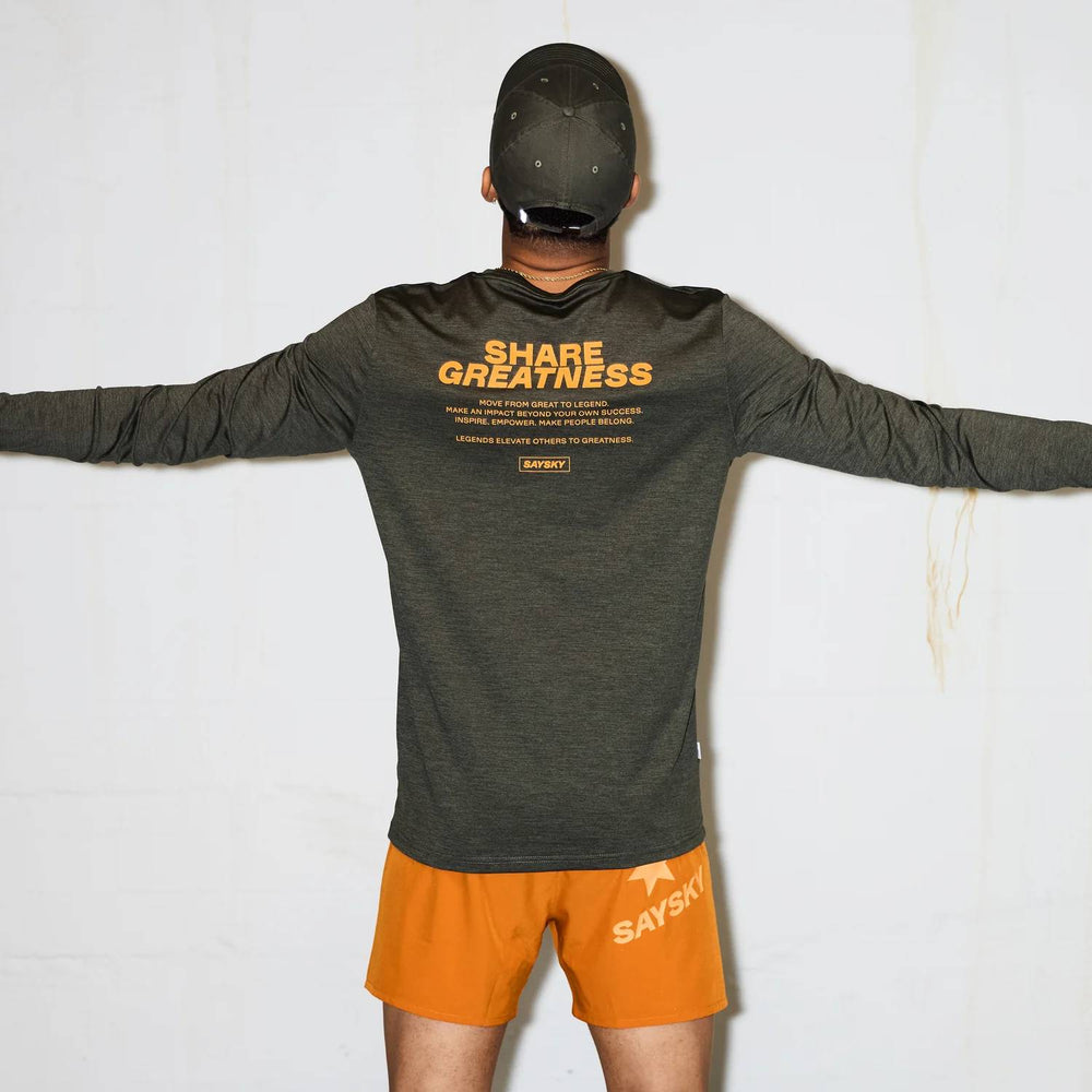 The SAYSKY Statement Pace Long Sleeve is a long sleeve running t-shirt with a motivating back print featuring a SAYSKY original statement. The pace fabric is ideal if you're looking for a slightly heavier, yet super soft fabric with great wicking abilities.