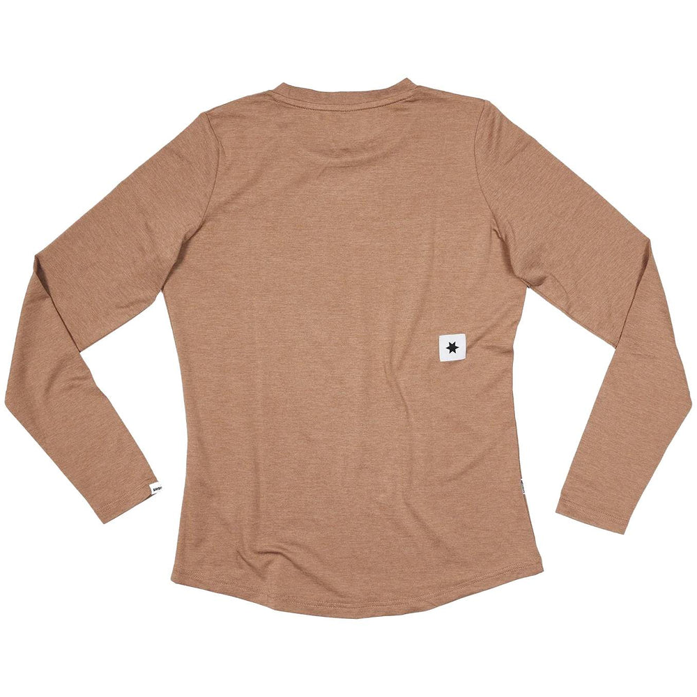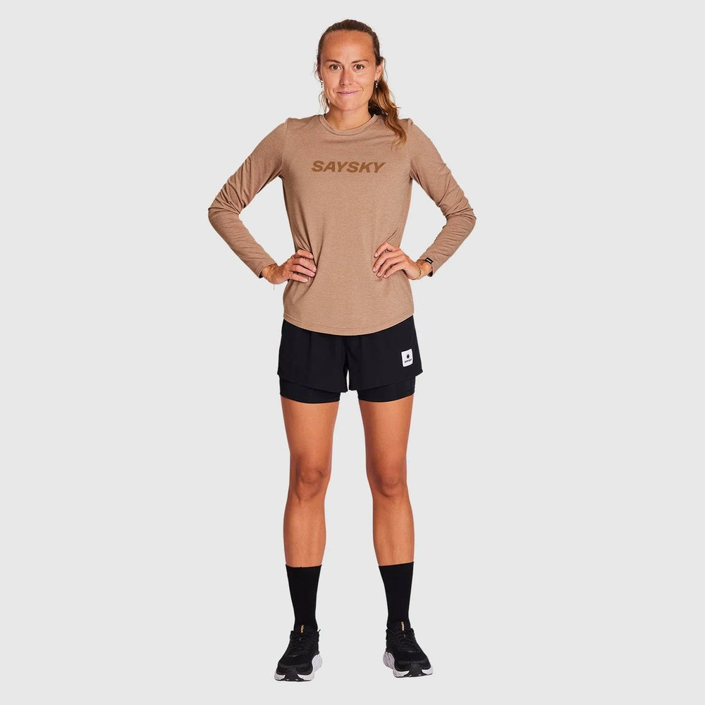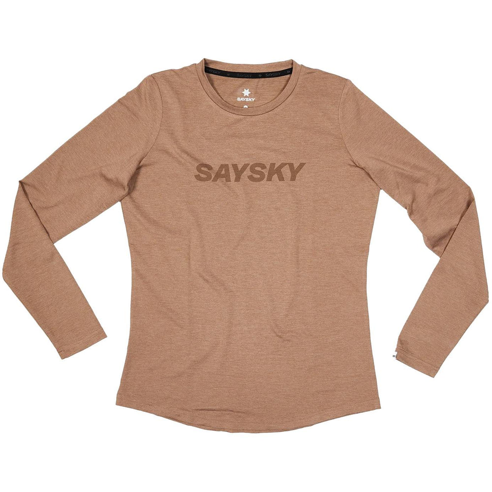 The SAYSKY Logo Pace Long Sleeve is a running t-shirt for women in green made from recycled polyester. It comes with a SAYSKY logo on the front and a woven SAYSKY label on the back.